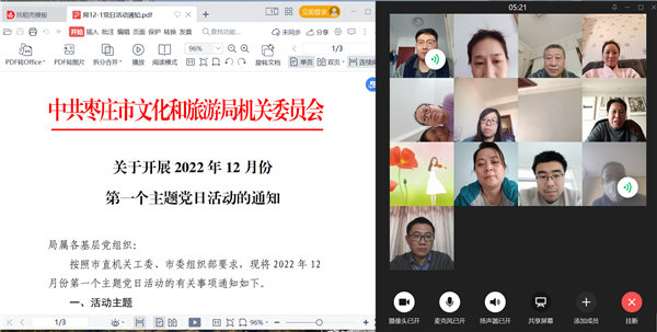 12月23日,按照市局机关委员会工作安排,市图书馆党支部开展2022年12月份第一个主题党日活动。活动以党小组为单位采用视频会议方式开展,第一、二党小组党员和群众参加。